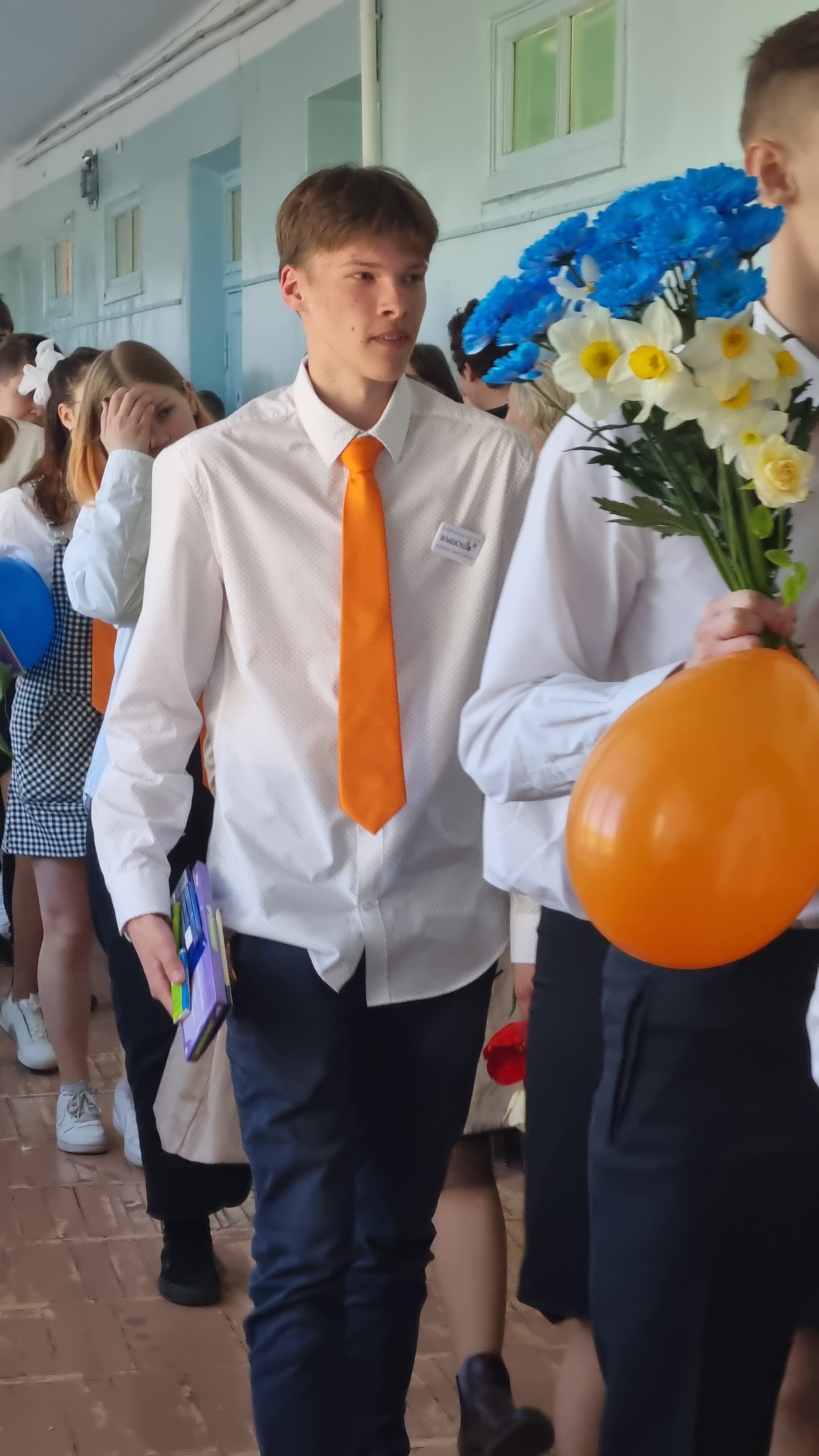 С 9 утра у них были уроки- классные часы, на которые к ним приходили первоклашки, учителя-предметники, первые учителя и все, кто хотел поздравить наших выпускников. После праздничных уроков ребят приветствовали младшие учащиеся, торжественно выстроившиеся по коридорам школы.